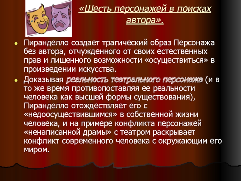 Доказывая реальность театрального персонажа (и в то же время противопоставляя ее реальности человека как высшей формы существования), Пиранделло отождествляет его с «недоосуществившимся» в собственной жизни человека, и на примере конфликта персонажей «ненаписанной драмы» с театром раскрывает конфликт современного человека с окружающим его миром.