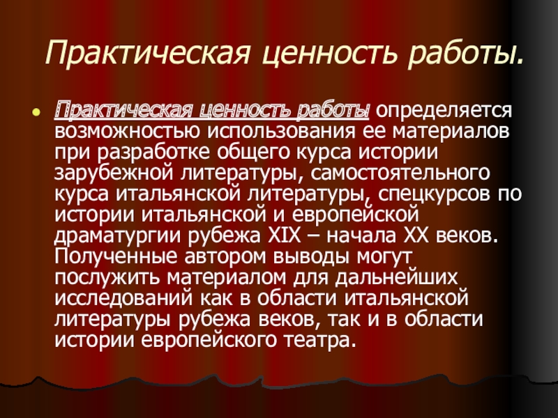 разработке общего курса истории зарубежной литературы, самостоятельного курса итальянской литературы, спецкурсов по истории итальянской и европейской драматургии рубежа XIX – начала ХХ веков. Полученные автором выводы могут послужить материалом для дальнейших исследований как в области итальянской литературы рубежа веков, так и в области истории европейского театра.