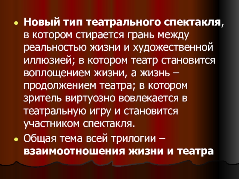 Слайд 16Новый тип театрального спектакля, в котором стирается грань между реальностью жизни