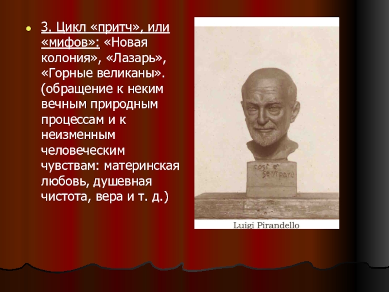 1. Веристские пьесы: «Сицилийские лимоны», «Подумай, Джакомино», «Лиола», «Колпак с бубенчиками» и др. (изображение провинциальной среды и конфликт героя с этой средой).