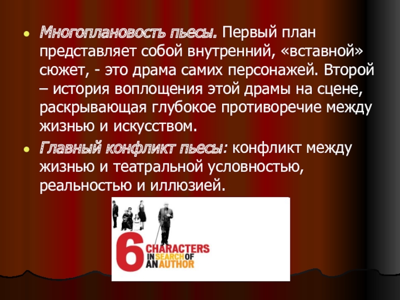 Слайд 18Многоплановость пьесы. Первый план представляет собой внутренний, «вставной» сюжет, - это