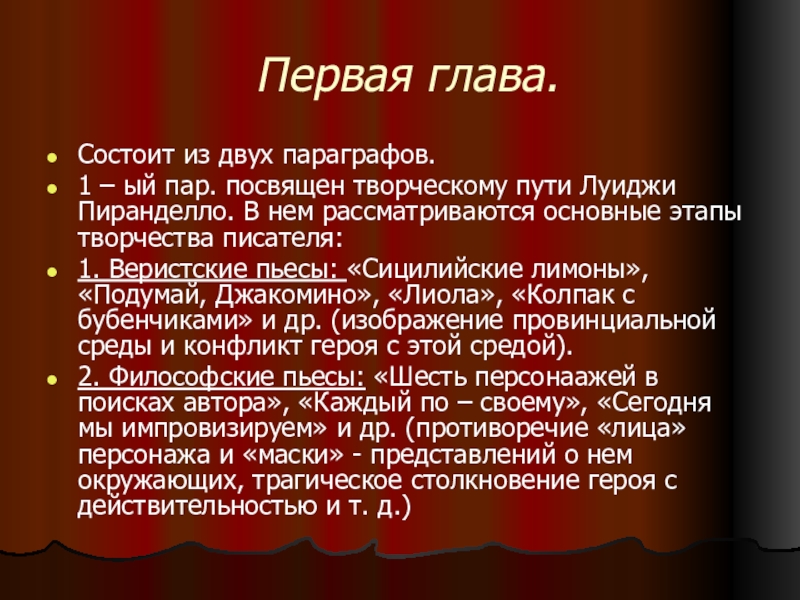Вторая глава посвящена анализу исследований творчества Л. Пиранделло русскими и