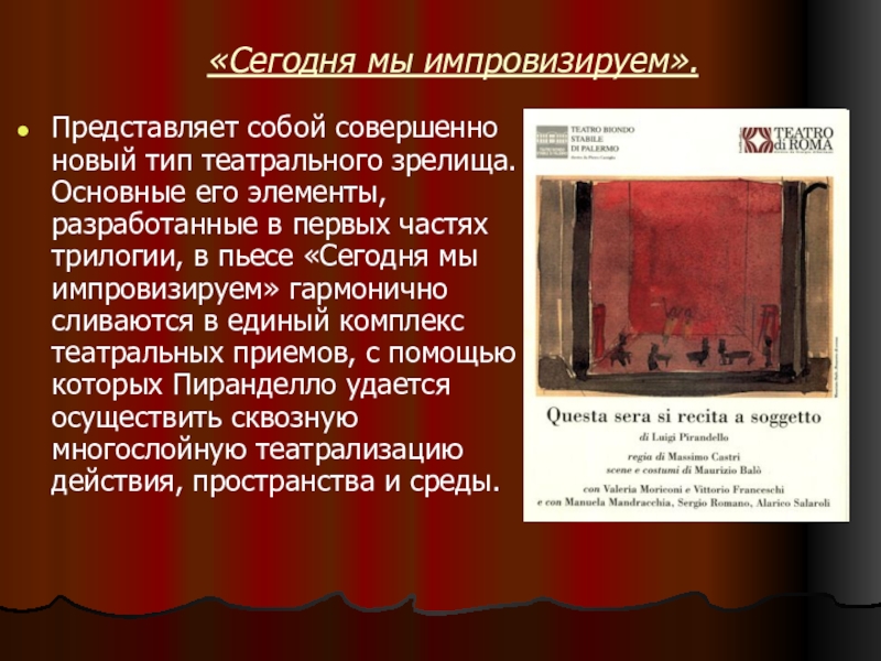элементы, разработанные в первых частях трилогии, в пьесе «Сегодня мы импровизируем» гармонично сливаются в единый комплекс театральных приемов, с помощью которых Пиранделло удается осуществить сквозную многослойную театрализацию действия, пространства и среды.