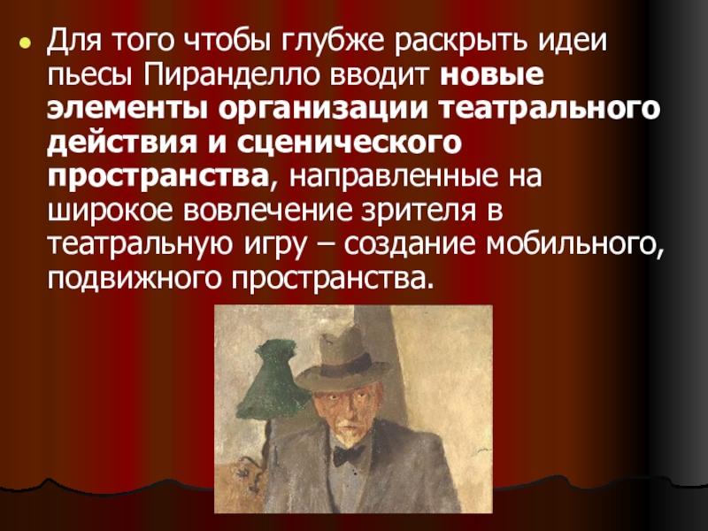 Слайд 21Для того чтобы глубже раскрыть идеи пьесы Пиранделло вводит новые элементы