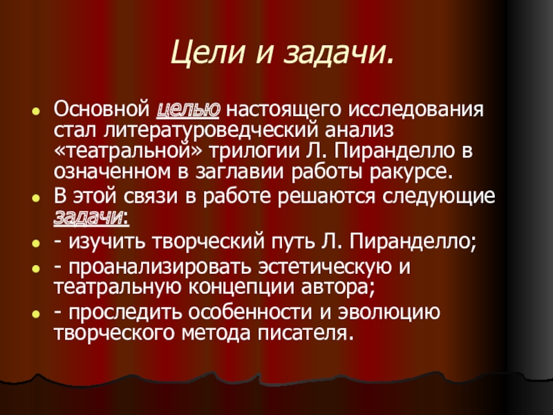 Предметом исследования является «театральная» трилогия Л. Пиранделло, рассматриваемая как комплекс