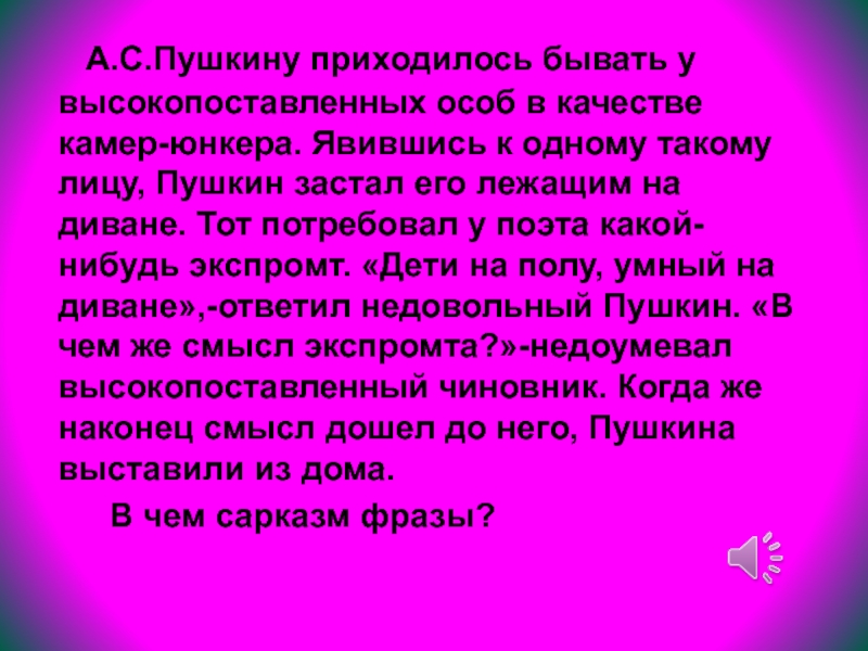 камер-юнкера. Явившись к одному такому лицу, Пушкин застал его лежащим на диване. Тот потребовал у поэта какой-нибудь экспромт. «Дети на полу, умный на диване»,-ответил недовольный Пушкин. «В чем же смысл экспромта?»-недоумевал высокопоставленный чиновник. Когда же наконец смысл дошел до него, Пушкина выставили из дома.