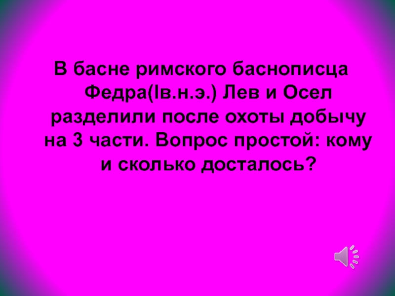 В басне римского баснописца Федра(Iв.н.э.) Лев и Осел разделили после охоты