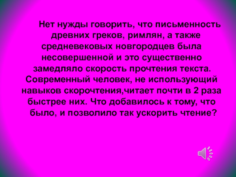 замедляло скорость прочтения текста. Современный человек, не использующий навыков скорочтения,читает почти в 2 раза быстрее них. Что добавилось к тому, что