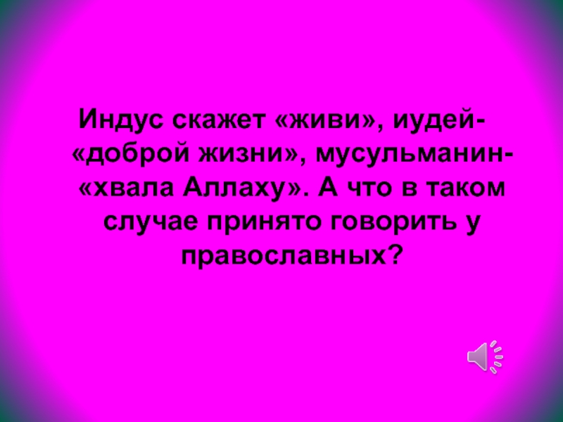Слайд 82Индус скажет «живи», иудей- «доброй жизни», мусульманин- «хвала Аллаху». А что