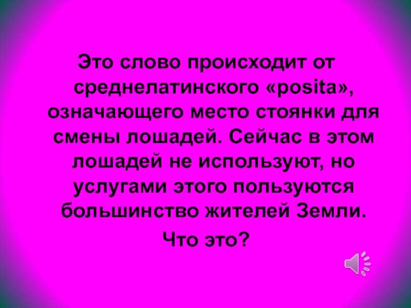 Слайд 56Это слово происходит от среднелатинского «posita», означающего место стоянки для смены