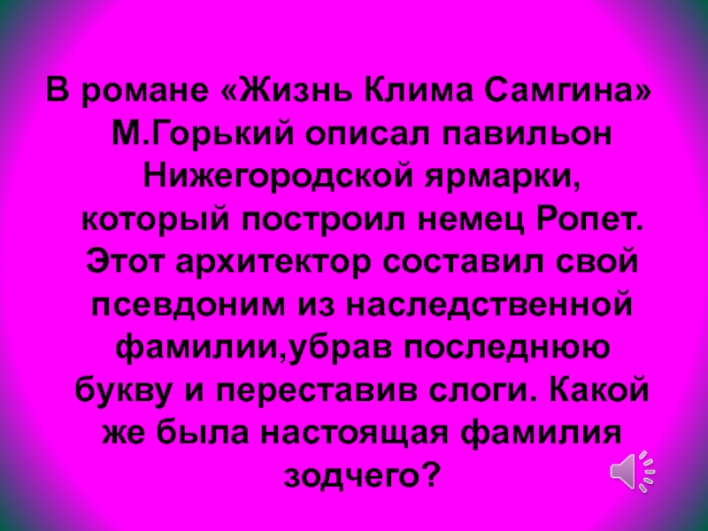 построил немец Ропет. Этот архитектор составил свой псевдоним из наследственной фамилии,убрав последнюю букву и переставив слоги. Какой же была настоящая фамилия зодчего?