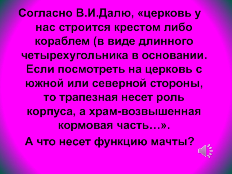 Слайд 62Согласно В.И.Далю, «церковь у нас строится крестом либо кораблем (в виде