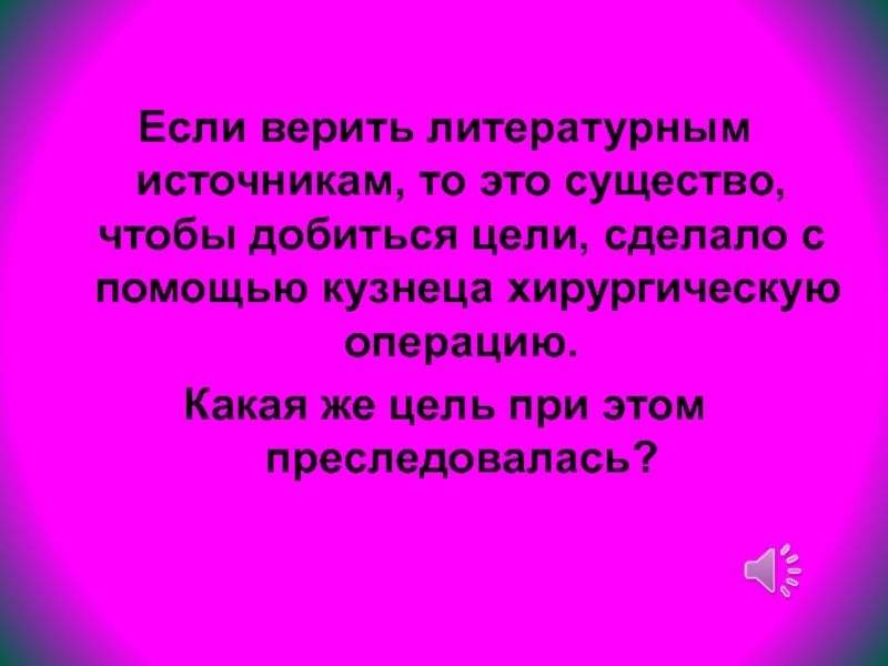 Слайд 9Если верить литературным источникам, то это существо, чтобы добиться цели, сделало