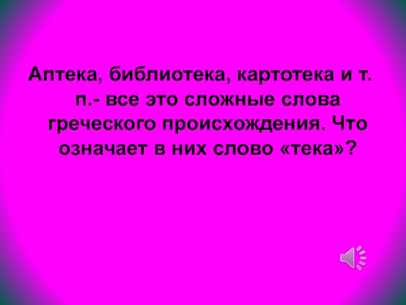 Слайд 39Аптека, библиотека, картотека и т.п.- все это сложные слова греческого происхождения.