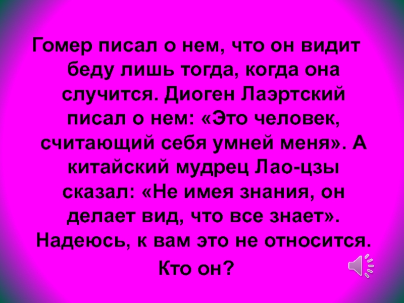когда она случится. Диоген Лаэртский писал о нем: «Это человек, считающий себя умней меня». А китайский мудрец Лао-цзы сказал: «Не имея знания, он делает вид, что все знает». Надеюсь, к вам это не относится.