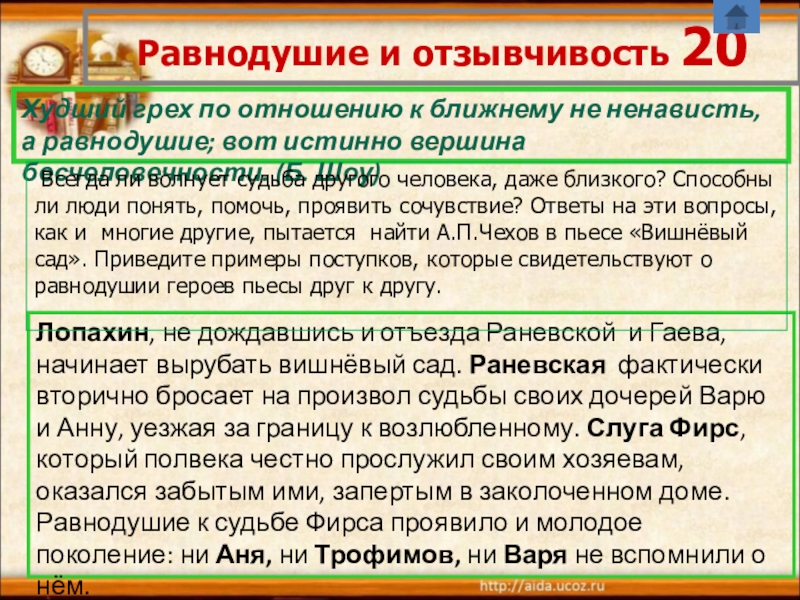 Всегда ли волнует судьба другого человека, даже близкого? Способны ли люди понять, помочь, проявить сочувствие? Ответы на эти вопросы, как и многие другие, пытается найти А.П.Чехов в пьесе «Вишнёвый сад». Приведите примеры поступков, которые свидетельствуют о равнодушии героев пьесы друг к другу.