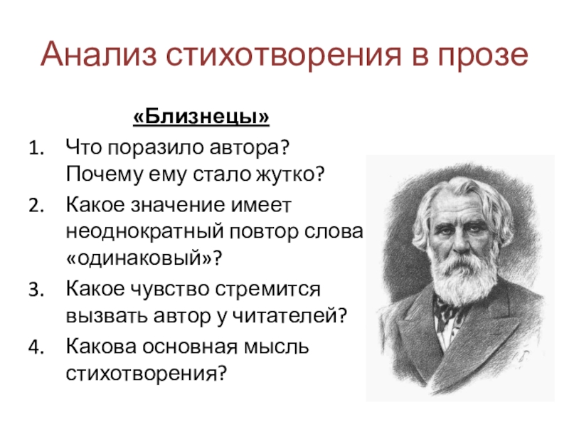 Анализ стихотворения в прозе«Близнецы»Что поразило автора? Почему ему стало жутко?Какое значение имеет неоднократный повтор слова «одинаковый»?Какое чувство