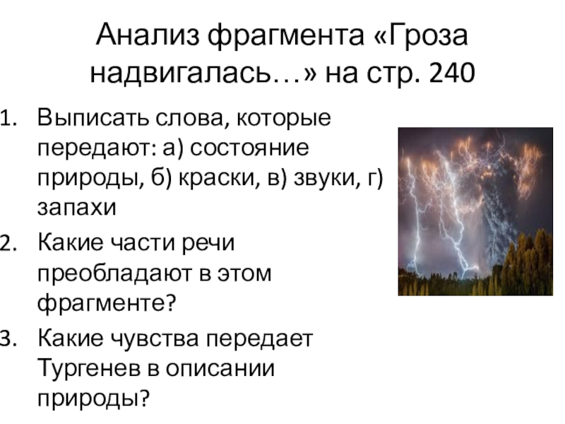 Анализ фрагмента «Гроза надвигалась…» на стр. 240Выписать слова, которые передают: а) состояние природы, б) краски, в) звуки, г) запахиКакие части речи преобладают в этом фрагменте?Какие чувства передает Тургенев в описании природы?