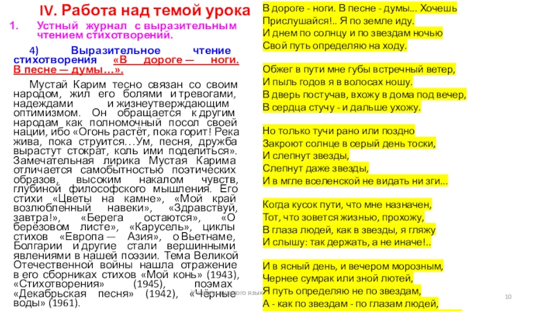 Красивая природа отчего края, изумительная устная поэзия родного народа — вот те живительные родники, которые питали богатое творческое воображение Мустая Карима, подобно камертону настраивали его звучную лиру. Мустай Карим — художник многогранного таланта. Он не только замечательный поэт, автор многих поэтических сборников, но и превосходный драматург, прозаик и критик, публицист и переводчик.