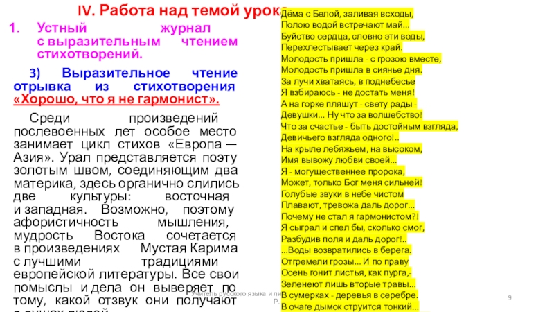 1) Выразительное чтение стихотворения И. Л. Киньябулатова «Нам повезло с тобой, Мустай!».