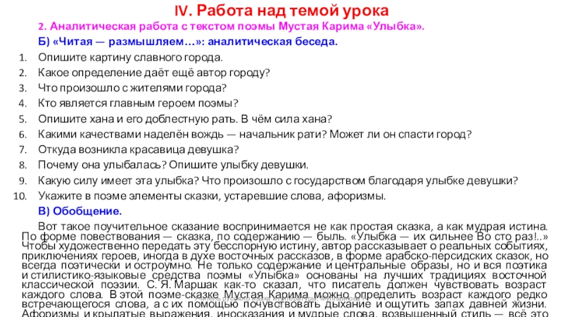 Мустай Карим — это целая огромная страна, страна яркая, светлая, манящая, благородная. Это страна, где торжествуют добро и справедливость, любовь и сострадание, высокое слово и незаурядный ум. Страна — открытая для всех: и любителей прекрасного, и искателей смысла жизни, и жаждущих совета, и нуждающихся в истине. И вхож в эту страну всякий: большой и малый, грешный и безгрешный, зрячий и слепой, мужчина и женщина, добрый и злой. К счастью, последние там не задерживаются. Потому что им нет места в мире Мустая, где он, утверждая общечеловеческие ценности, возвеличивает свой башкирский народ, возвышает его дух, определяет его место в мировой культуре. Возвеличивает, возвышает, определяет по-своему, по-мустаевски,— направляя в бой за высокое состояние духа свои мысли, облечённые в волнующие поэтические строки, в непревзойдённые драматургические диалоги, в убедительнейшие рассуждения и доказательства в прозе. И не считаясь ни с какими границами, летят по стране, миру его слова, заставляя открыться любое сердце.