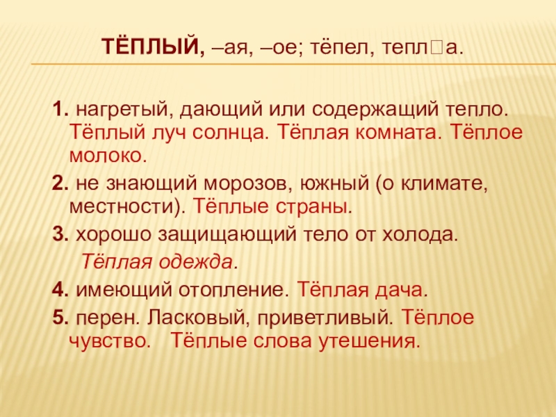 Слайд 5ТЁПЛЫЙ, –ая, –ое; тёпел, тепл˜а.