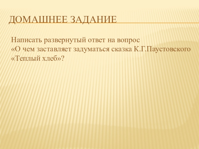 Домашнее заданиеНаписать развернутый ответ на вопрос «О чем заставляет задуматься сказка К.Г.Паустовского «Теплый хлеб»?