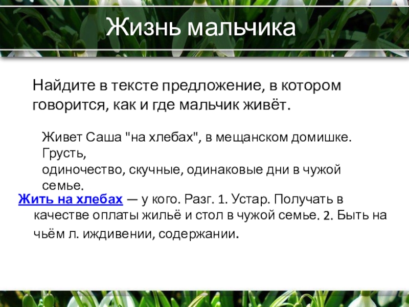 Найдите в тексте предложение, в котором говорится, как и где мальчик живёт.
