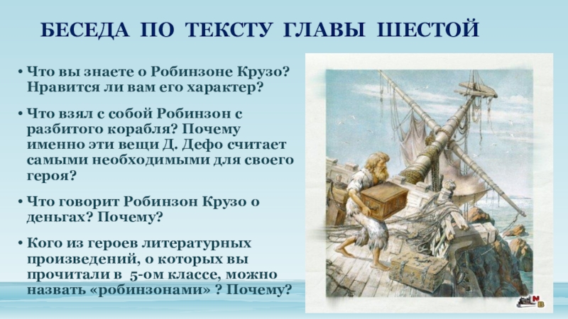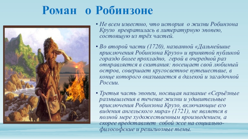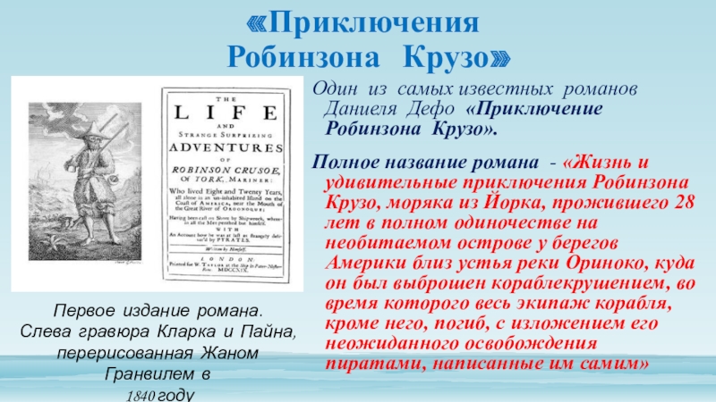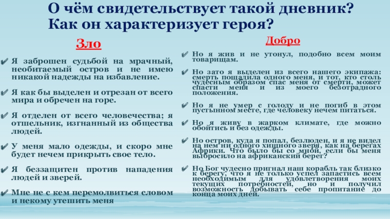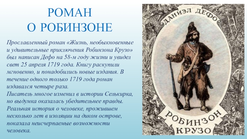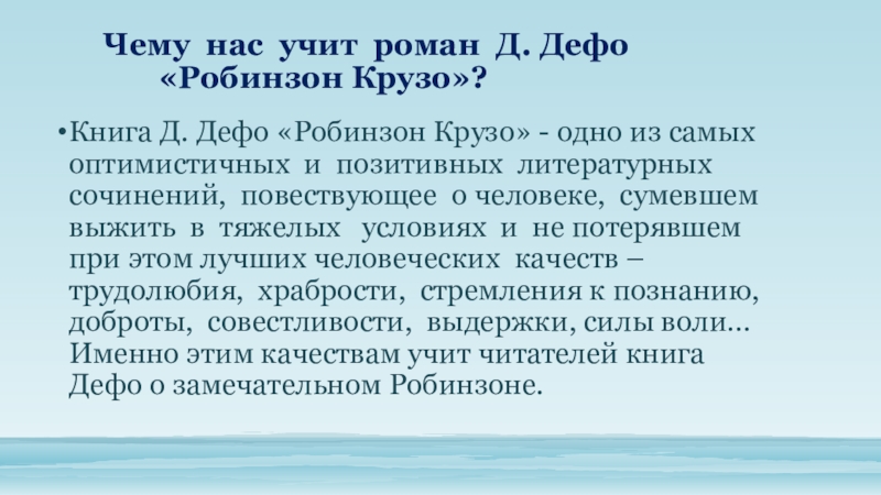 Книга Д. Дефо «Робинзон Крузо» - одно из самых оптимистичных и позитивных литературных сочинений, повествующее о человеке, сумевшем выжить в тяжелых условиях и не потерявшем при этом лучших человеческих качеств – трудолюбия, храбрости, стремления к познанию, доброты, совестливости, выдержки, силы воли… Именно этим качествам учит читателей книга Дефо о замечательном Робинзоне.