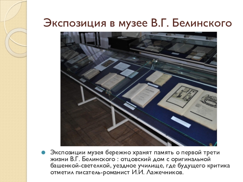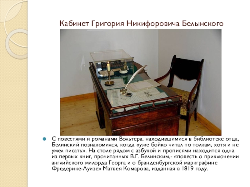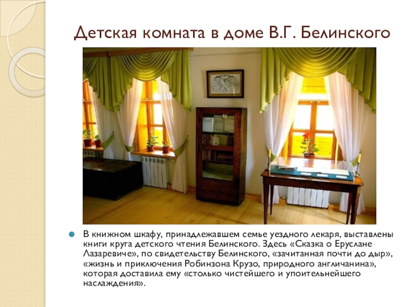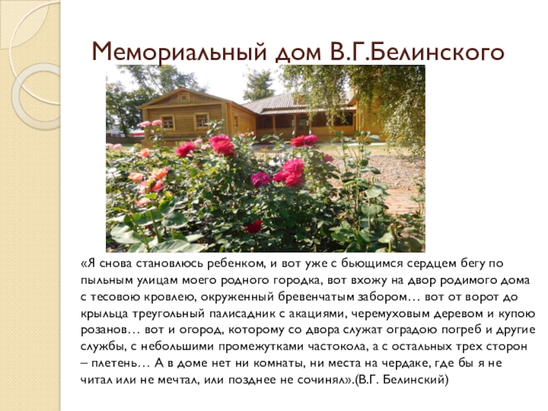 Григорьевич Белинский был привезен пятилетним мальчиком и в родительском доме безвыездно жил с 1816 по 1825 год, регулярно бывал на рождественских, пасхальных и летних каникулах с 1825 по 1830 год во времена учебы.