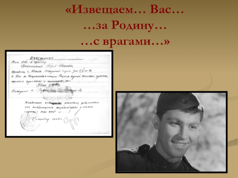 Слайд 2«Извещаем… Вас… …за Родину… …с врагами…»
