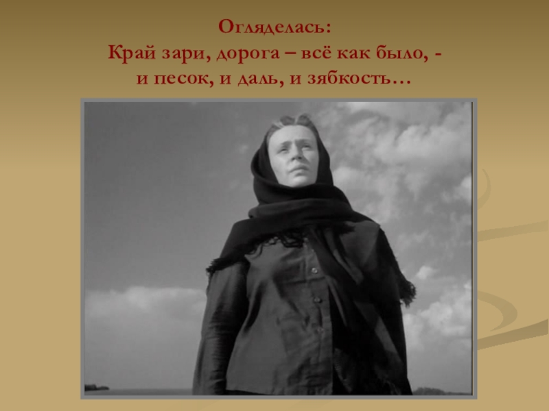 Слайд 4Огляделась: Край зари, дорога – всё как было, - и песок, и