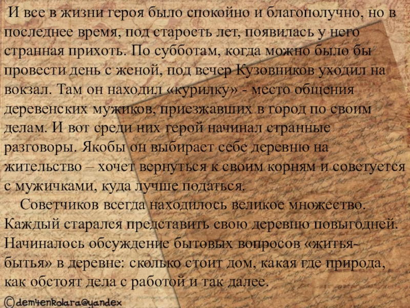 последнее время, под старость лет, появилась у него странная прихоть. По субботам, когда можно было бы провести день с женой, под вечер Кузовников уходил на вокзал. Там он находил «курилку» - место общения деревенских мужиков, приезжавших в город по своим делам. И вот среди них герой начинал странные разговоры. Якобы он выбирает себе деревню на жительство – хочет вернуться к своим корням и советуется с мужичками, куда лучше податься.