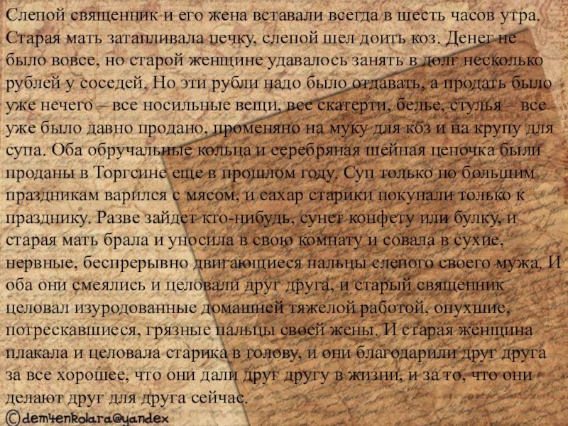 Старая мать затапливала печку, слепой шел доить коз. Денег не было вовсе, но старой женщине удавалось занять в долг несколько рублей у соседей. Но эти рубли надо было отдавать, а продать было уже нечего – все носильные вещи, все скатерти, белье, стулья – все уже было давно продано, променяно на муку для коз и на крупу для супа. Оба обручальные кольца и серебряная шейная цепочка были проданы в Торгсине еще в прошлом году. Суп только по большим праздникам варился с мясом, и сахар старики покупали только к празднику. Разве зайдет кто-нибудь, сунет конфету или булку, и старая мать брала и уносила в свою комнату и совала в сухие, нервные, беспрерывно двигающиеся пальцы слепого своего мужа. И оба они смеялись и целовали друг друга, и старый священник целовал изуродованные домашней тяжелой работой, опухшие, потрескавшиеся, грязные пальцы своей жены. И старая женщина плакала и целовала старика в голову, и они благодарили друг друга за все хорошее, что они дали друг другу в жизни, и за то, что они делают друг для друга сейчас.