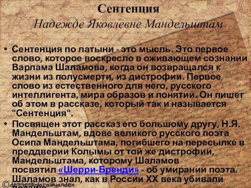 слово, которое воскресло в оживающем сознании Варлама Шаламова, когда он возвращался к жизни из полусмерти, из дистрофии. Первое слово из естественного для него, русского интеллигента, мира образов и понятий. Он пишет об этом в рассказе, который так и называется "Сентенция".