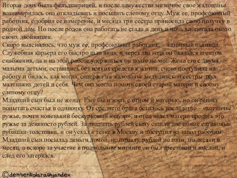 Слайд 41Вторая дочь была фельдшерицей, и после замужества мизерное свое жалованье вознамерилась