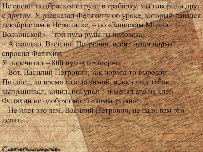 Я рассказал Федяхину об уроке, который давался декабристам в Нерчинске, – по «Запискам Марии Волконской» – три пуда руды на человека.