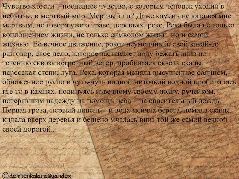 в мертвый мир. Мертвый ли? Даже камень не казался мне мертвым, не говоря уже о траве, деревьях, реке. Река была не только воплощением жизни, не только символом жизни, но и самой жизнью. Ее вечное движение, рокот неумолчный, свой какой-то разговор, свое дело, которое заставляет воду бежать вниз по течению сквозь встречный ветер, пробиваясь сквозь скалы, пересекая степи, луга. Река, которая меняла высушенное солнцем, обнаженное русло и чуть-чуть видной ниточкой водной пробиралась где-то в камнях, повинуясь извечному своему долгу, ручейком, потерявшим надежду на помощь неба – на спасительный дождь. Первая гроза, первый ливень – и вода меняла берега, ломала скалы, кидала вверх деревья и бешено мчалась вниз той же самой вечной своей дорогой...