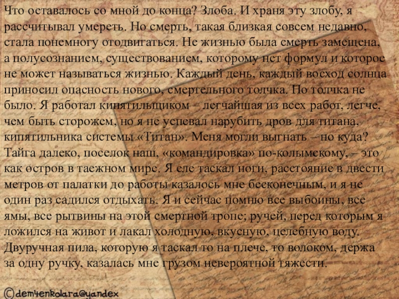я рассчитывал умереть. Но смерть, такая близкая совсем недавно, стала понемногу отодвигаться. Не жизнью была смерть замещена, а полусознанием, существованием, которому нет формул и которое не может называться жизнью. Каждый день, каждый восход солнца приносил опасность нового, смертельного толчка. Но толчка не было. Я работал кипятильщиком – легчайшая из всех работ, легче, чем быть сторожем, но я не успевал нарубить дров для титана, кипятильника системы «Титан». Меня могли выгнать – но куда? Тайга далеко, поселок наш, «командировка» по-колымскому, – это как остров в таежном мире. Я еле таскал ноги, расстояние в двести метров от палатки до работы казалось мне бесконечным, и я не один раз садился отдыхать. Я и сейчас помню все выбоины, все ямы, все рытвины на этой смертной тропе; ручей, перед которым я ложился на живот и лакал холодную, вкусную, целебную воду. Двуручная пила, которую я таскал то на плече, то волоком, держа за одну ручку, казалась мне грузом невероятной тяжести.