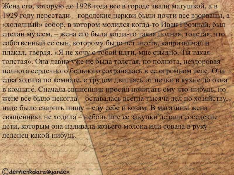 Слайд 35Жена его, которую до 1928 года все в городе звали матушкой,