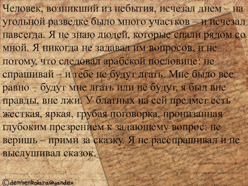 Слайд 14Человек, возникший из небытия, исчезал днем – на угольной разведке было много