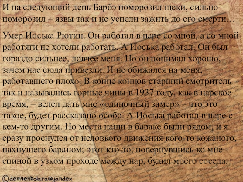 мной работяги не хотели работать. А Иоська работал. Он был гораздо сильнее, ловчее меня. Но он понимал хорошо, зачем нас сюда привезли. И не обижался на меня, работавшего плохо. В конце концов старший смотритель – так и назывались горные чины в 1937 году, как в царское время, – велел дать мне «одиночный замер» – что это такое, будет рассказано особо. А Иоська работал в паре с кем-то другим. Но места наши в бараке были рядом, и я сразу проснулся от неловкого движения кого-то кожаного, пахнущего бараном; этот кто-то, повернувшись ко мне спиной в узком проходе между нар, будил моего соседа: