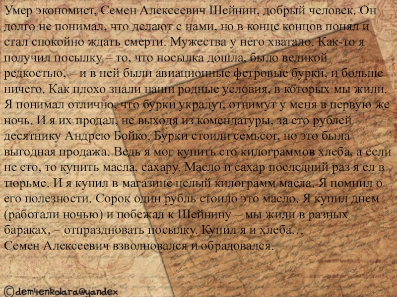Слайд 6Умер экономист, Семен Алексеевич Шейнин, добрый человек. Он долго не понимал,