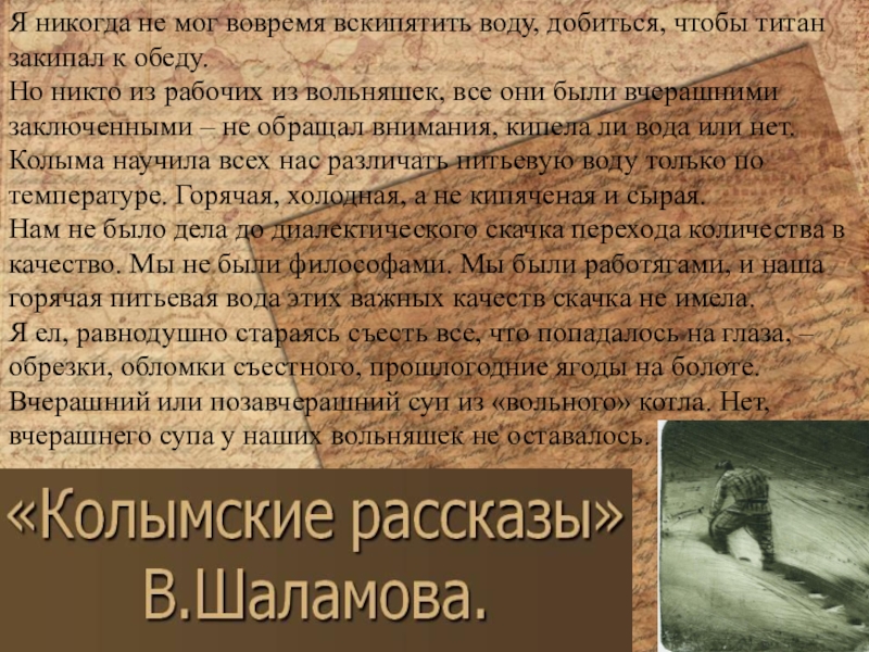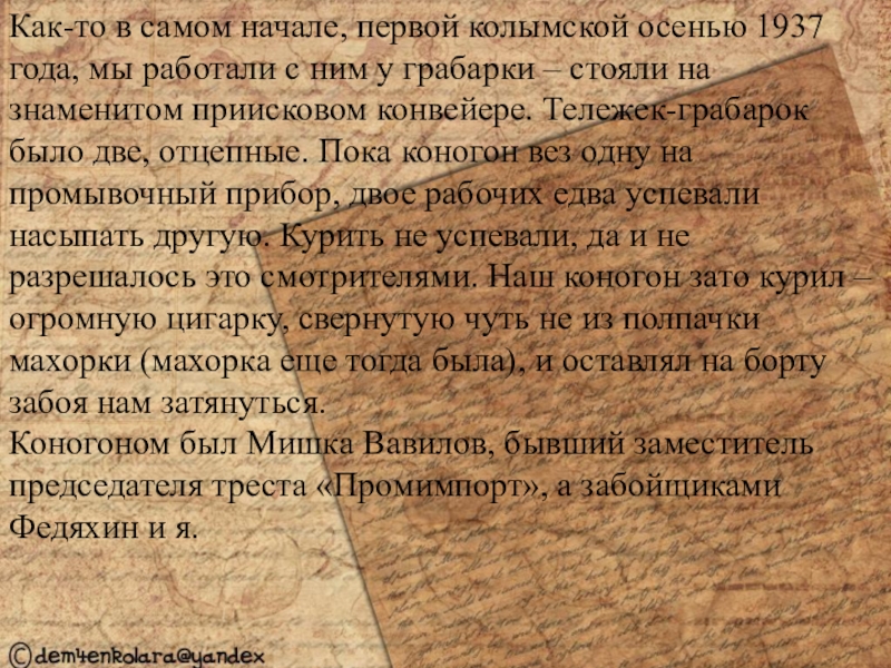 Слайд 9Как-то в самом начале, первой колымской осенью 1937 года, мы работали