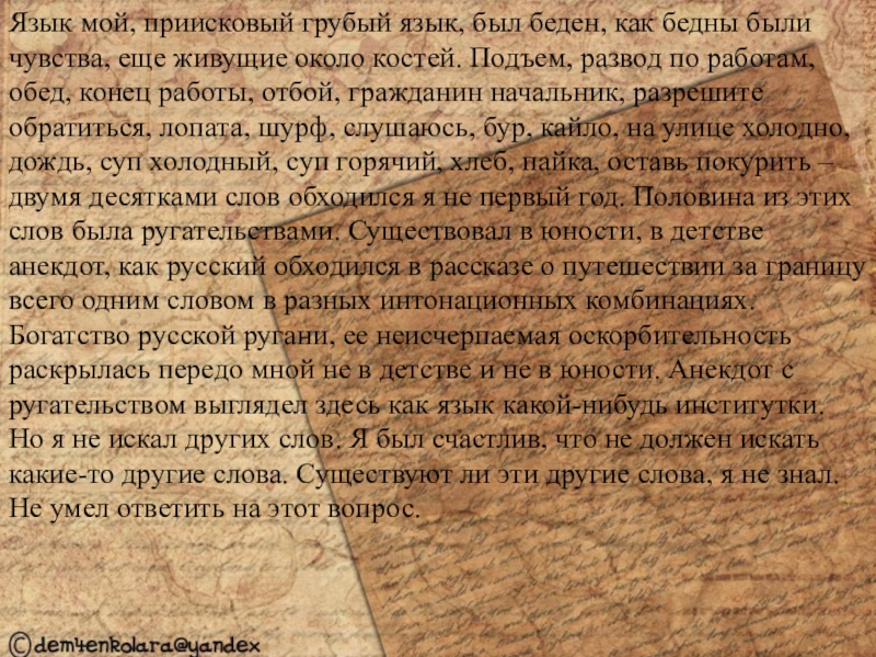 Слайд 25Язык мой, приисковый грубый язык, был беден, как бедны были чувства,