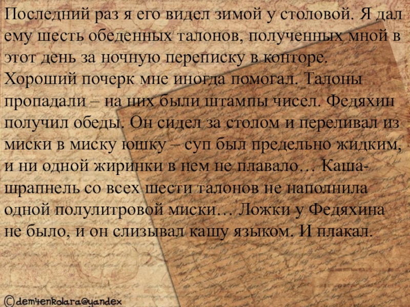 шесть обеденных талонов, полученных мной в этот день за ночную переписку в конторе. Хороший почерк мне иногда помогал. Талоны пропадали – на них были штампы чисел. Федяхин получил обеды. Он сидел за столом и переливал из миски в миску юшку – суп был предельно жидким, и ни одной жиринки в нем не плавало… Каша-шрапнель со всех шести талонов не наполнила одной полулитровой миски… Ложки у Федяхина не было, и он слизывал кашу языком. И плакал.