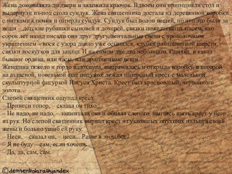 – Не надо, не надо, – зашептала она и обняла слепого, пытаясь взять крест у него из рук. Но слепой священник вырвал крест из узловатых опухших пальцев своей жены и больно ушиб ей руку.