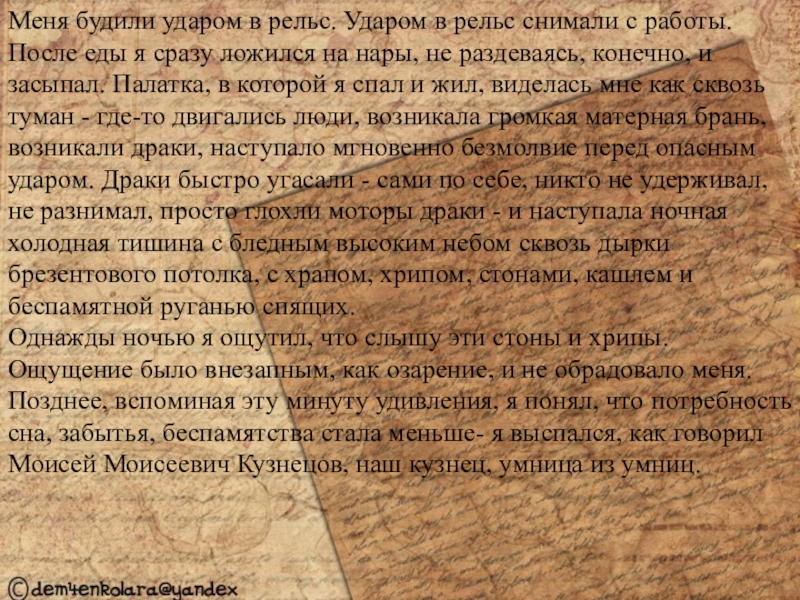 Слайд 19Меня будили ударом в рельс. Ударом в рельс снимали с работы.