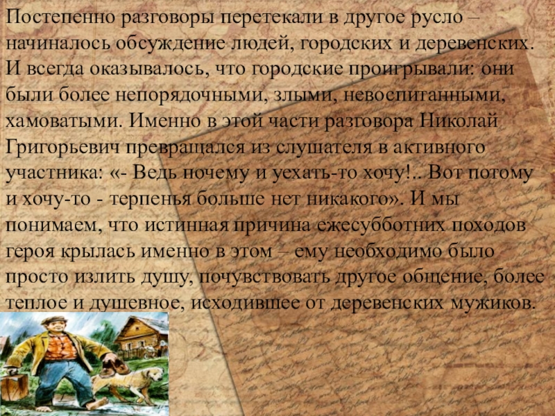 и деревенских. И всегда оказывалось, что городские проигрывали: они были более непорядочными, злыми, невоспитанными, хамоватыми. Именно в этой части разговора Николай Григорьевич превращался из слушателя в активного участника: «- Ведь почему и уехать-то хочу!.. Вот потому и хочу-то - терпенья больше нет никакого». И мы понимаем, что истинная причина ежесубботних походов героя крылась именно в этом – ему необходимо было просто излить душу, почувствовать другое общение, более теплое и душевное, исходившее от деревенских мужиков.