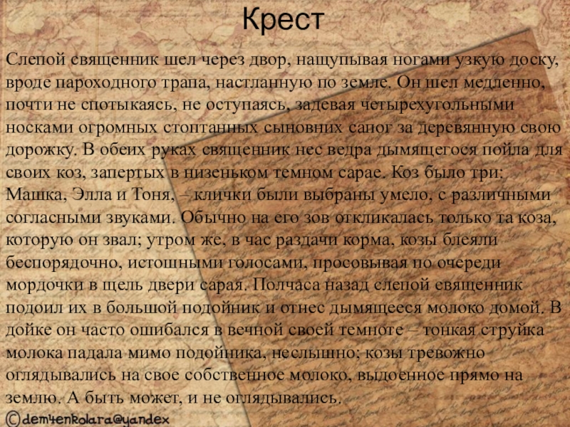 пароходного трапа, настланную по земле. Он шел медленно, почти не спотыкаясь, не оступаясь, задевая четырехугольными носками огромных стоптанных сыновних сапог за деревянную свою дорожку. В обеих руках священник нес ведра дымящегося пойла для своих коз, запертых в низеньком темном сарае. Коз было три: Машка, Элла и Тоня, – клички были выбраны умело, с различными согласными звуками. Обычно на его зов откликалась только та коза, которую он звал; утром же, в час раздачи корма, козы блеяли беспорядочно, истошными голосами, просовывая по очереди мордочки в щель двери сарая. Полчаса назад слепой священник подоил их в большой подойник и отнес дымящееся молоко домой. В дойке он часто ошибался в вечной своей темноте – тонкая струйка молока падала мимо подойника, неслышно; козы тревожно оглядывались на свое собственное молоко, выдоенное прямо на землю. А быть может, и не оглядывались.